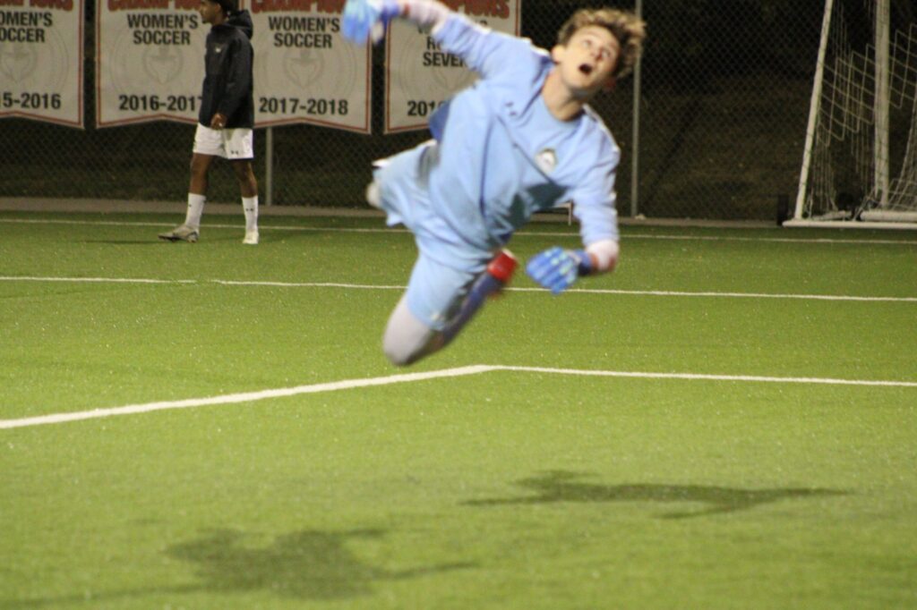 Goalkeeper Owen Pelc makes a diving save attempt during practice.