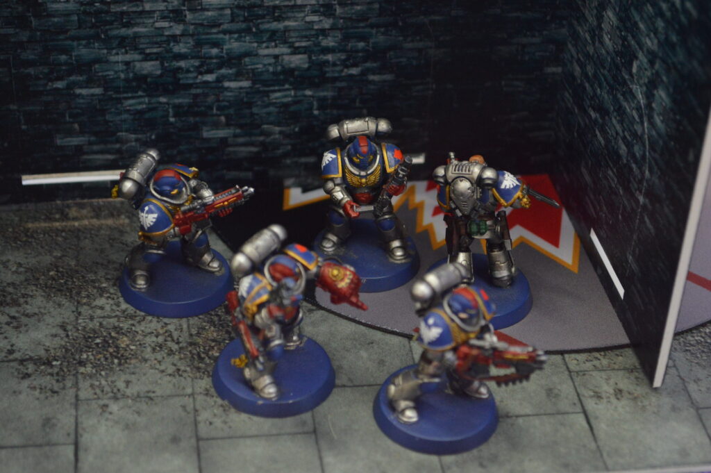 A close up of painted warhammer figures. Taken at a Primarch Club gathering.