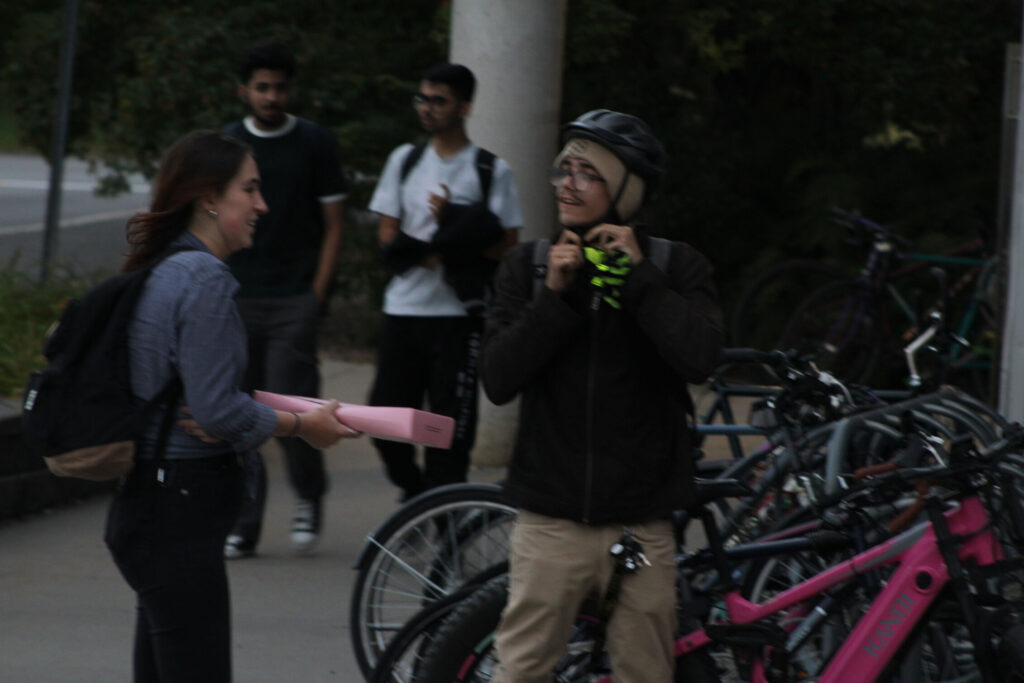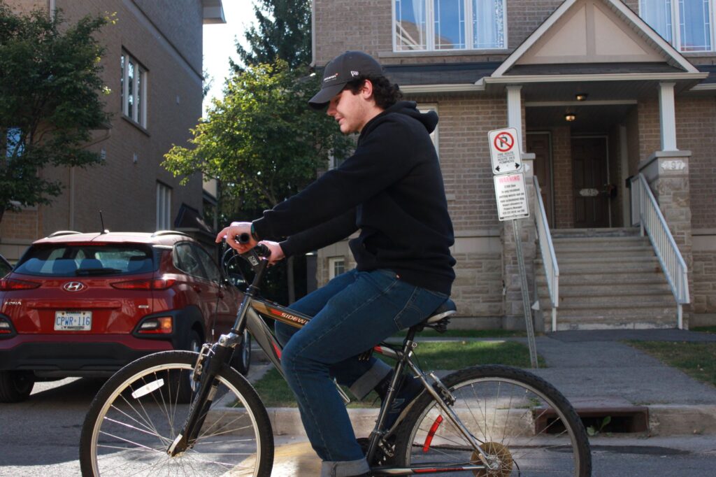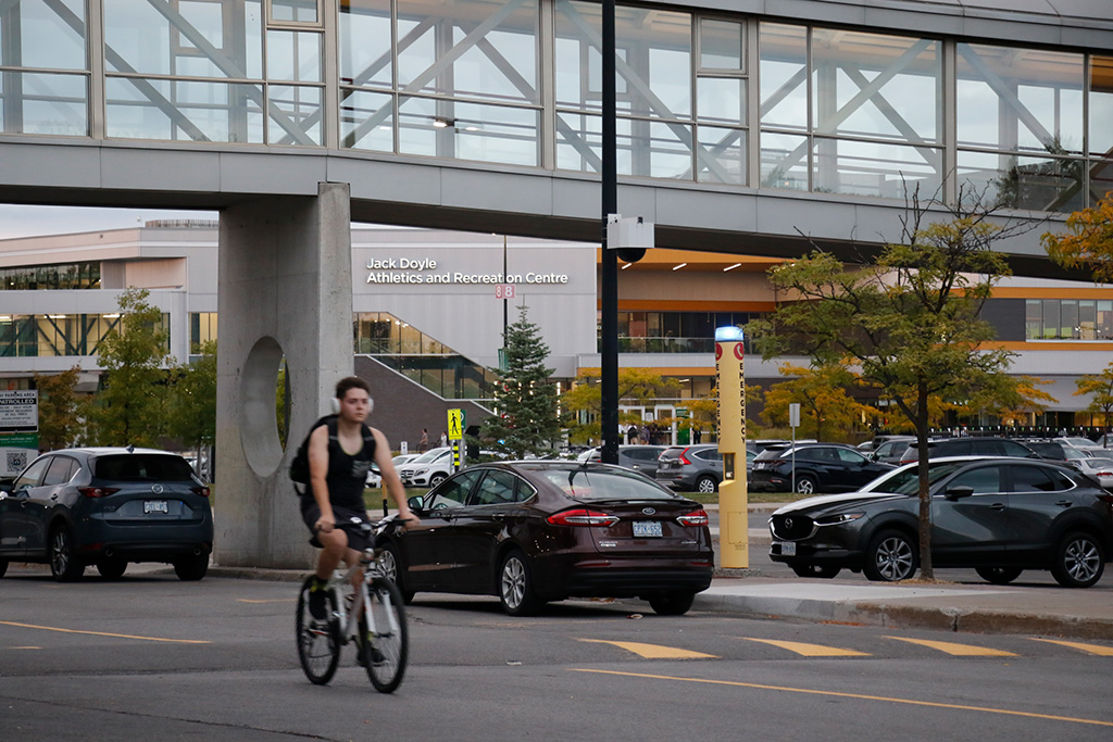 A bicyclist ride by the N-building at the Algonquin College Ottawa campus on Sept. 18. Medium shot