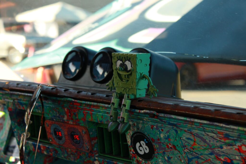 Green SpongeBob on the dash of a car.