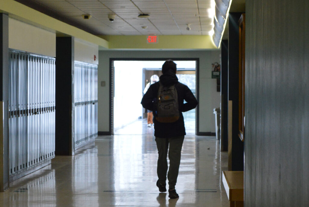 A student with their back turned walking through N building.